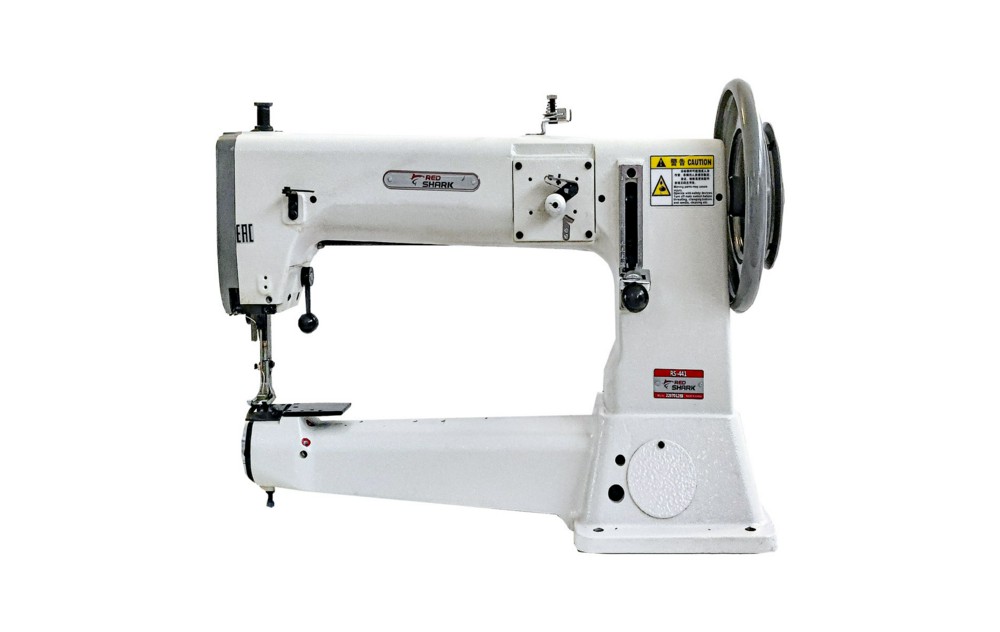 Одноигольная машина с рукавной платформой челночного стежка с унисонным продвижением, с качающимся челноком.