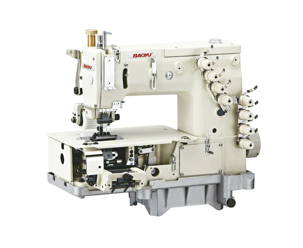 Четырехигольная восьминиточная швейная машина цепного стежка с встроенным серводвигателем, блоком управления и фронтальным механическим устройством равномерной подачи эластичной резинки