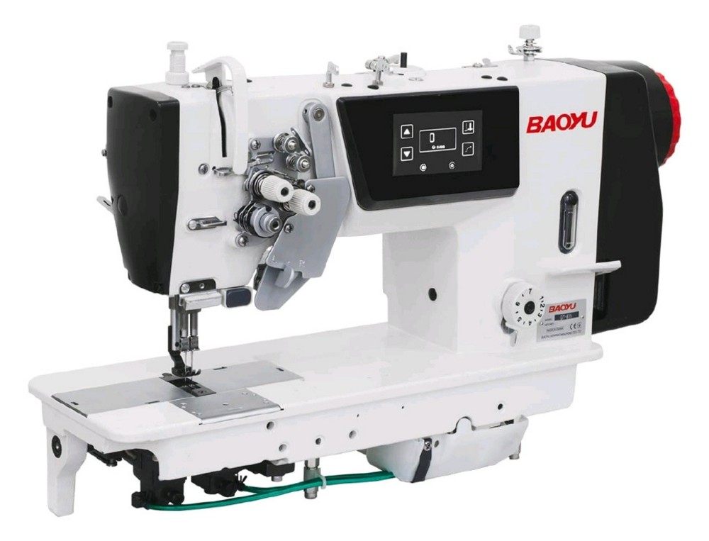 Двухигольная прямострочная машина челночного стежка с игольным и нижним продвижением материалов, встроенным серводвигателем и блоком управления, с отключением игл и увеличенными челноками