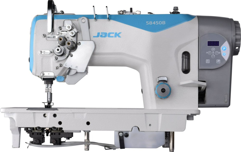 Двухигольная прямострочная машина челночного стежка с игольным и нижним продвижением материалов, с встроенным серводвигателем, увеличенными челноками, с отключением игл