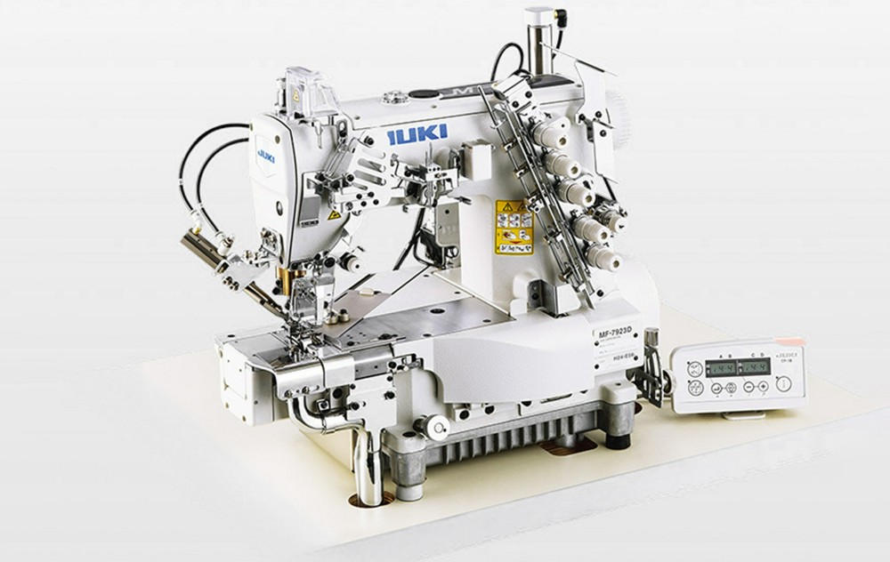 3-игольная 5-ниточная плоскошовная (распошивальная) машина цепного стежка с цилиндрической платформой, верхним и нижним застилом, приспособлением для подгибки среза и устройством левосторонней обрезки среза, автоматическими функциями и электронным управлением.