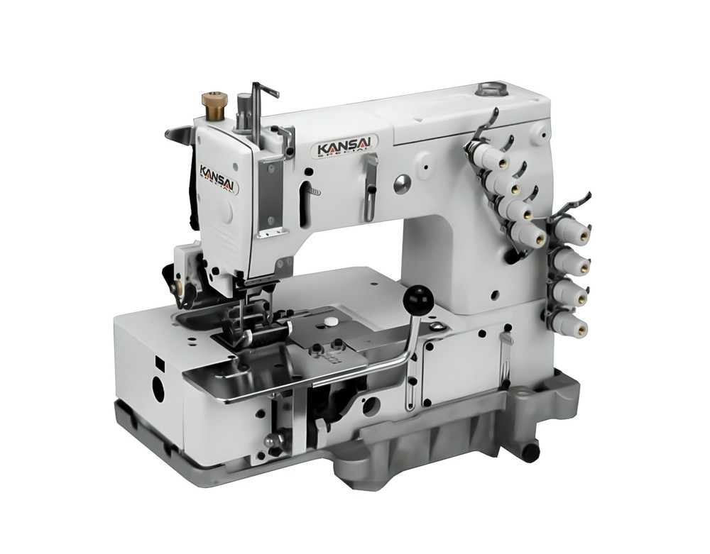 Шестигольная машина двойного цепного стежка с плоской платформой, с независимыми роликами, с регулировкой угла наклона для притачивания сложного пояса джинсов.