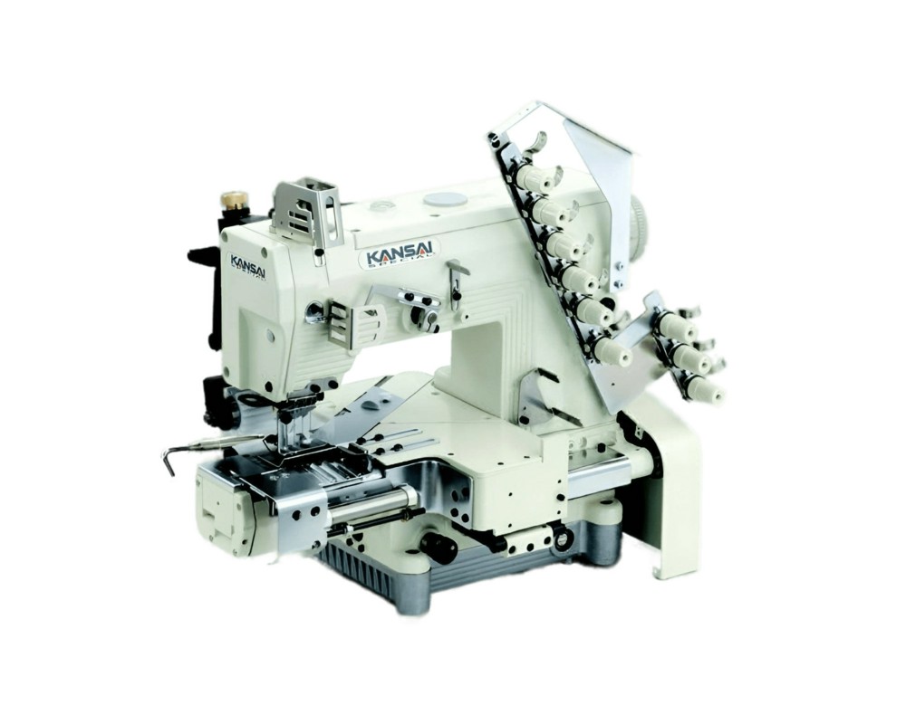 Пятиигольная машина с цилиндрической платформой (диаметр 340 мм) для втачивания резинки в пояс, с последовательно расположенными иглами, с механизмом горизонтального хода петлителя, с пневматической обрезкой нити и подъемом лапки.