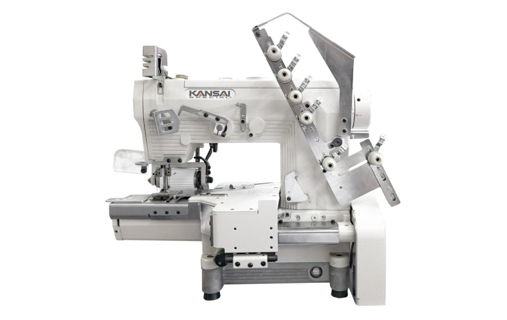 Четырехигольная машина с цилиндрической платформой (диаметр 340 мм) для втачивания резинки в пояс, с последовательно расположенными иглами, с механизмом горизонтального хода петлителя, выполняет два параллельных шва.