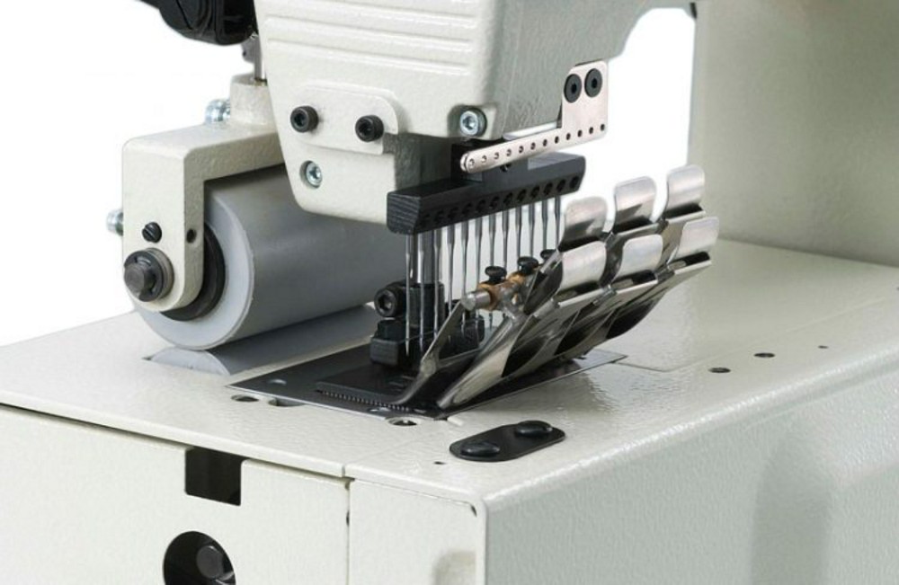 Двенадцатиигольная машина двойного цепного стежка с плоской платформой для настрачивания «лампасов», с пуллером.