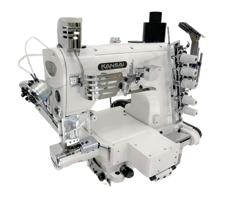 Трехигольная высокоскоростная плоскошовная машина с верхним и нижним застилом с цилиндрической платформой малого диаметра (180 мм) для подгибки края изделия
