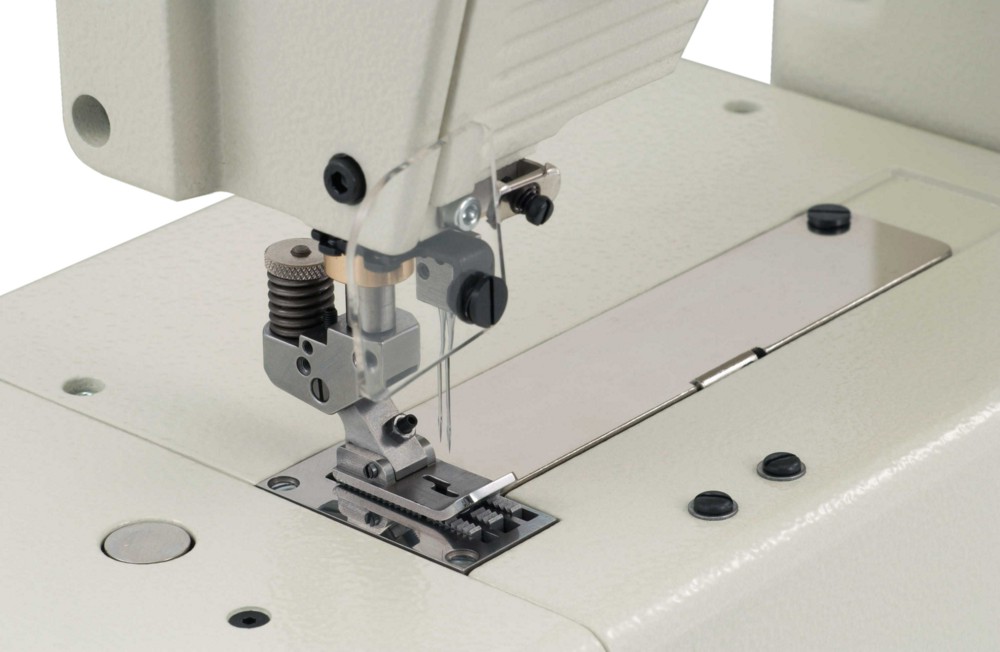 Двухигольная высокоскоростная машина двойного цепного стежка с плоской платформой, с специальной прижимной лапкой (с последовательно соединенными иглами).