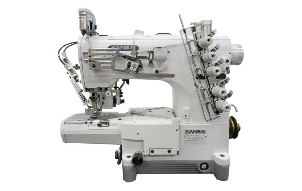 Трехигольная высокоскоростная плоскошовная машина с верхним и нижним застилом с цилиндрической платформой (диаметр 280 мм) с механизмом внешнего нитепритягивателя нити петлителя