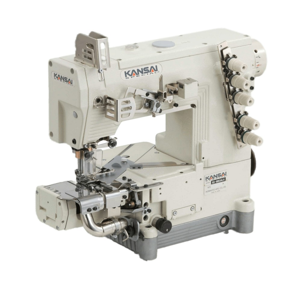 Трехигольная высокоскоростная плоскошовная машина с верхним и нижним застилом с цилиндрической платформой (диаметр 280 мм) с приспособлением для подгибки.
