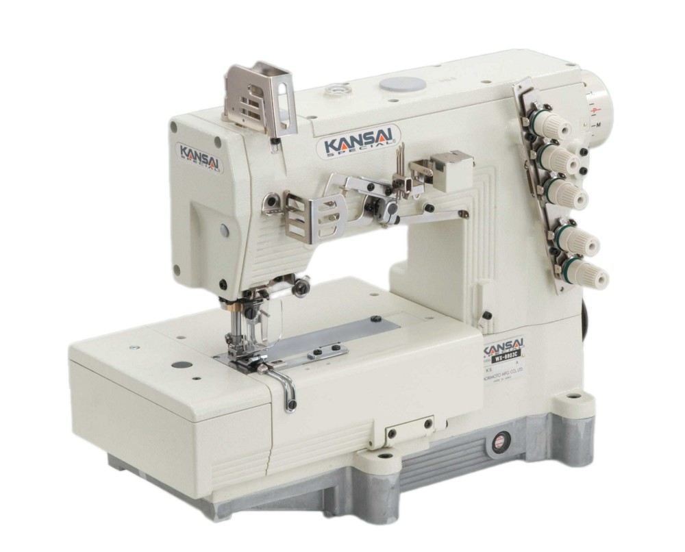 Трехигольная высокоскоростная плоскошовная машина с верхним и нижним застилом с плоской платформой для выполнения окантовки бейкой, с верхним продвижением ткани