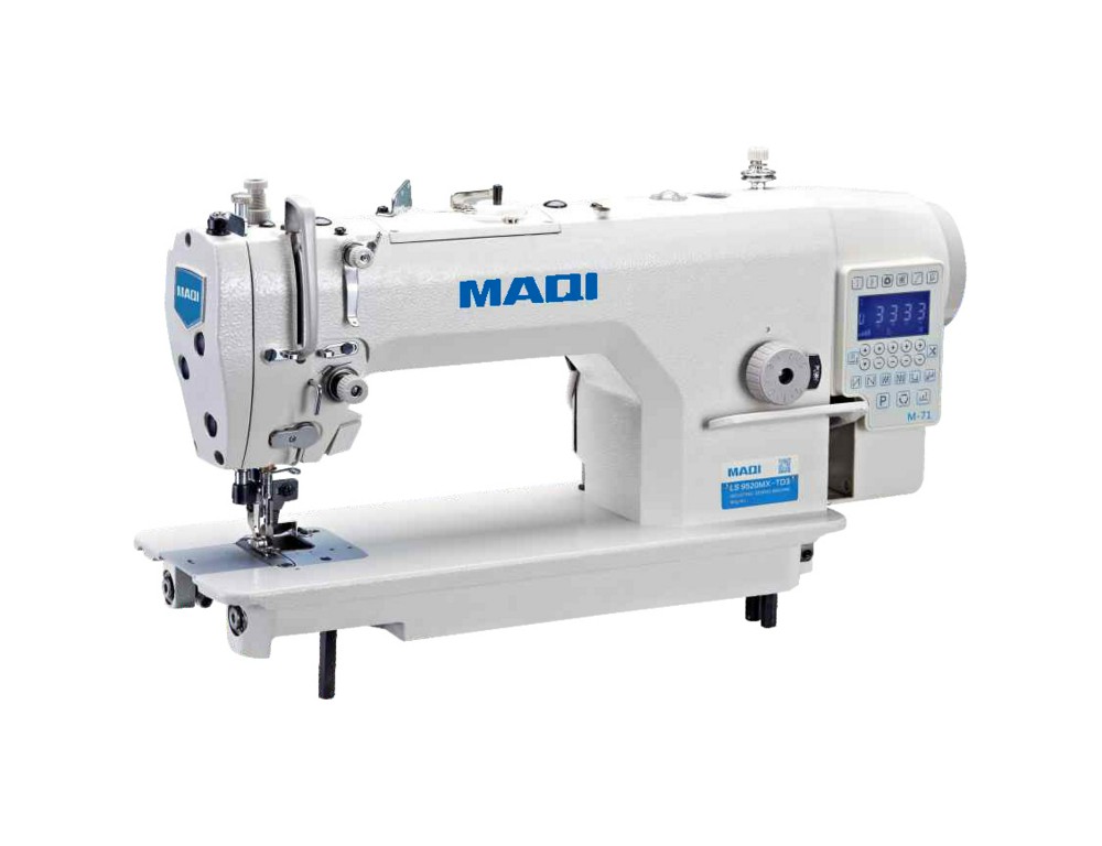Одноигольная прямострочная машина челночного стежка с нижним продвижением, плоской платформой, встроенным серводвигателем, ножом для подрезки срезов и автоматическими функциями.
