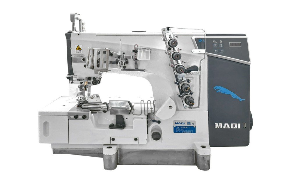 3-игольная 5-ниточная плоскошовная (распошивальная) машина верхним и нижним застилом, с плоской платформой, встроенным серводвигателем, электронным блоком управления и специальным приспособлением под окантовку