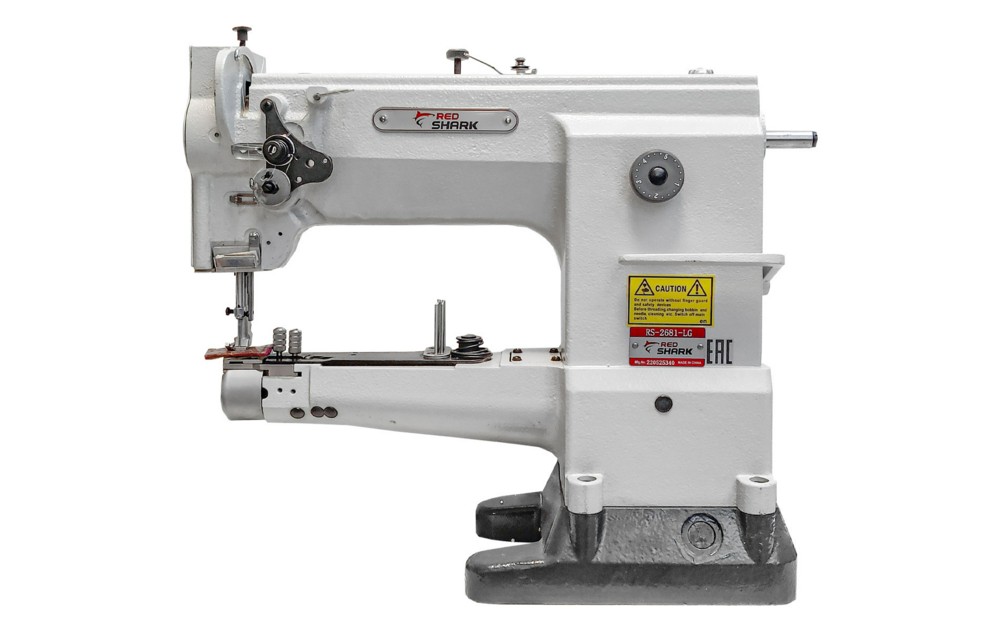 Промышленная одноигольная машина челночного стежка с тройным (унисонным) продвижением с платформой рукавного типа.