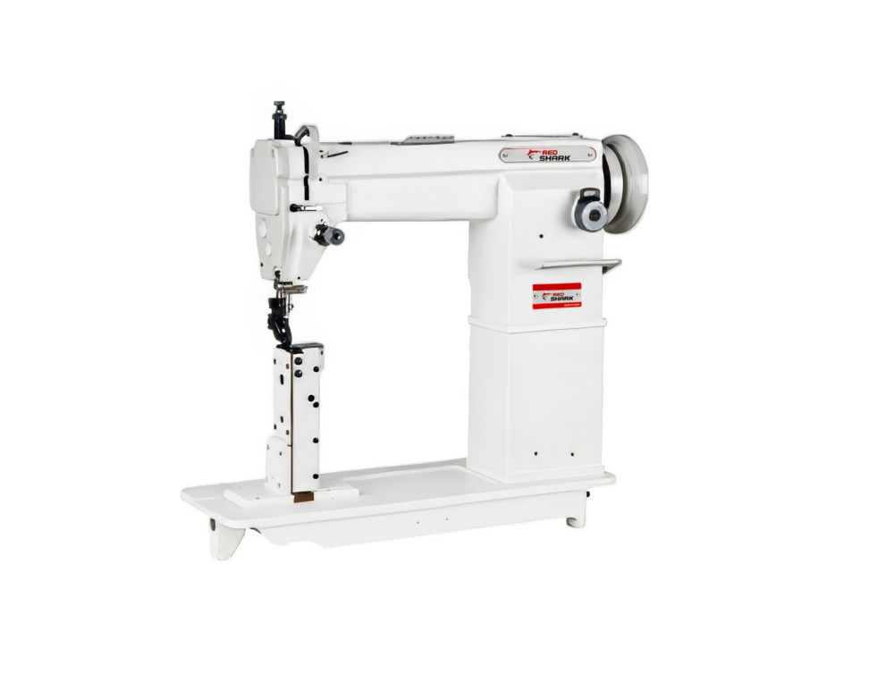 Одноигольная колонковая машина челночного стежка с игольным продвижением, с нижним и верхним прижимными роликами.