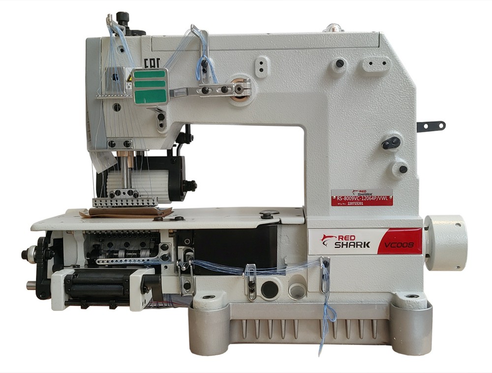 Двенадцатиигольная машина цепного стежка с приспособлением для передней натяжки резинки.