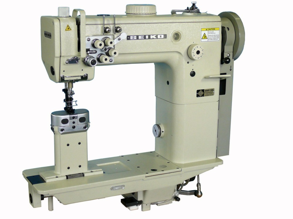Двухигольная машина челночного стежка без отключения игл с колонковой платформой и унисонным продвижением материала. Увеличенные челноки, регулировка хода внутренней прижимной лапки (1-7 мм).