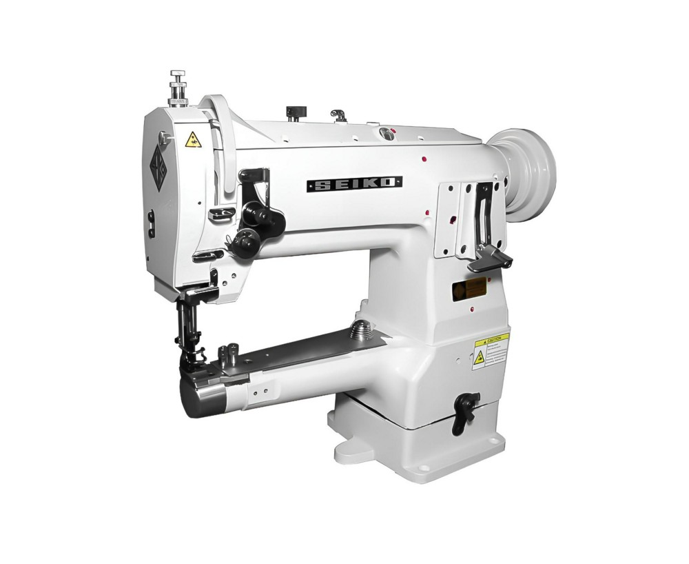 Одноигольная машина челночного стежка с рукавной платформой, унисонным продвижением материала и движущейся платформой(для окантовки). Увеличенный челнок, регулировка хода внутренней прижимной лапки (3-6 мм).