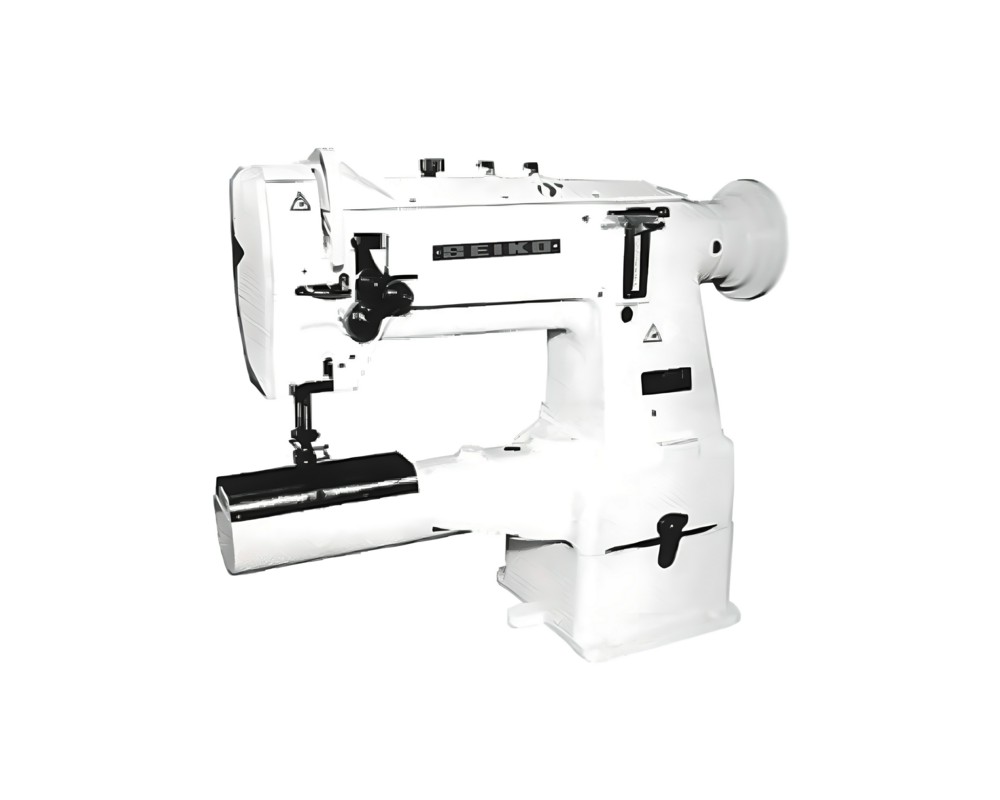 Двухигольная машина челночного стежка с рукавной платформой и унисонной подачей материала. Увеличенный челнок с вертикальной осью вращения, регулировка хода внутренней прижимной лапки (2.7-5.5 мм).