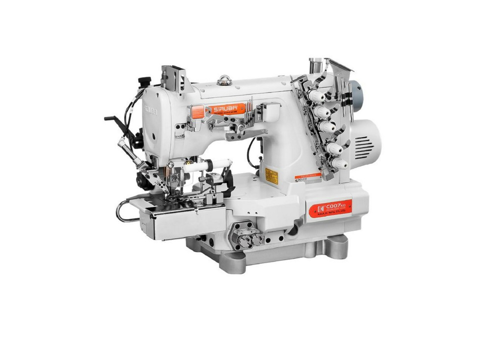 3-игольная 5-ниточная плоскошовная (распошивальная) машина цепного стежка с цилиндрической платформой, верхним и нижним застилом, с устройством для подшивания среза, электрическим устройством обрезки нитей, задним пуллером плоского типа, позиционером иглы, электромагнитом подъема лапки