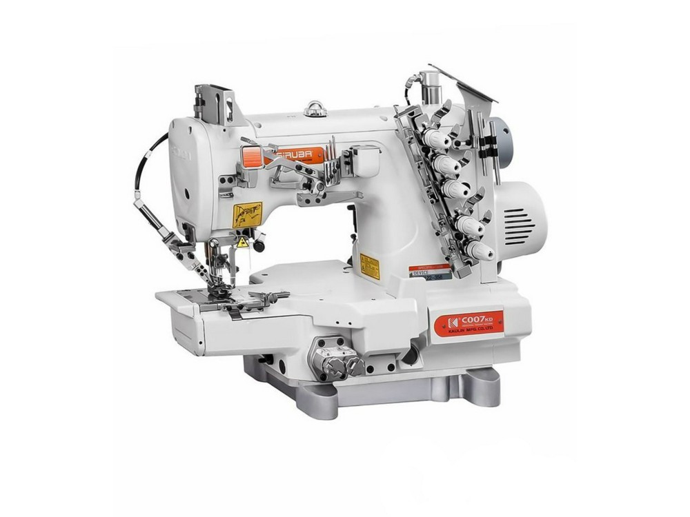 3-игольная 5-ниточная плоскошовная машина цепного стежка с цилиндрической (рукавной) платформой, встроенным серводвигателем с прямым приводом, верхним и нижним застилом, приспособлением для подгибки среза, автоматическими функциями