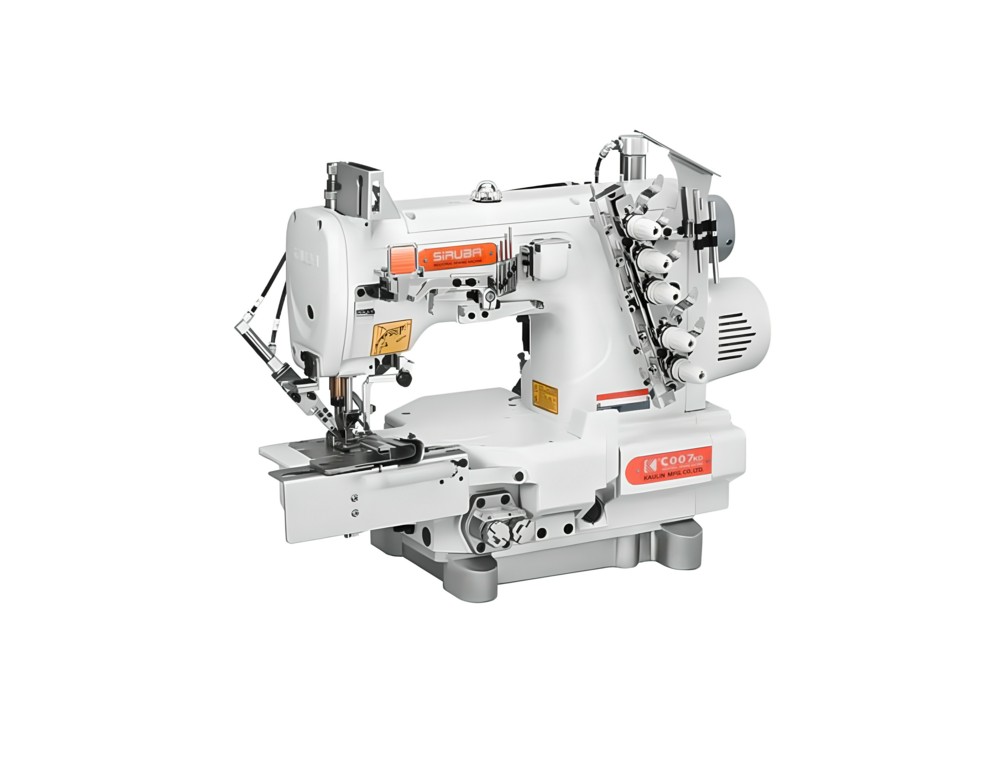 3-игольная 5-ниточная плоскошовная машина цепного стежка с цилиндрической платформой, встроенным серводвигателем с прямым приводом, верхним и нижним застилом, пневматической вставкой эластичной ленты под подогнутый срез, электрическим устройством обрезки нитей, системой роликов для обработки замкнутого среза изделия «в кольцо», автоматическими функциями