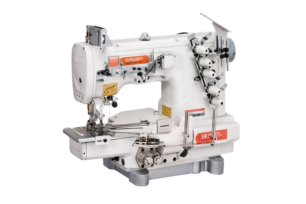 Трехигольная пятиниточная плоскошовная (распошивальная)машина с верхним и нижним застилом, рукавной платформой, встроенным серводвигателем и с приспособлением для окантовки срезов.