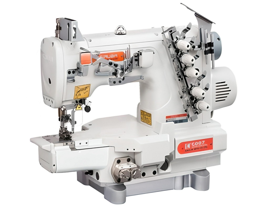 3-игольная 5-ниточная плоскошовная (распошивальная) машина цепного стежка с цилиндрической платформой, встроенным серводвигателем с прямым приводом, верхним и нижним застилом, с устройством для подгибки среза