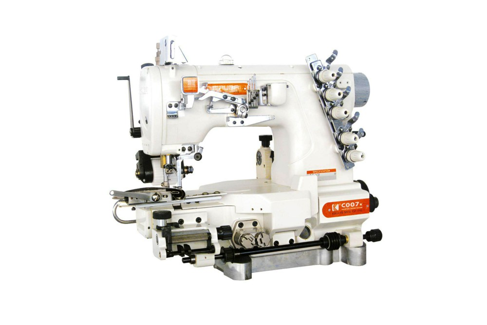 3-игольная 5-ниточная плоскошовная (распошивальная) машина цепного стежка с цилиндрической (рукавной) платформой, верхним и нижним застилом, с устройством для подачи эластичной тесьмы, пуллером зубчатого типа, приспособлением для подгибки среза