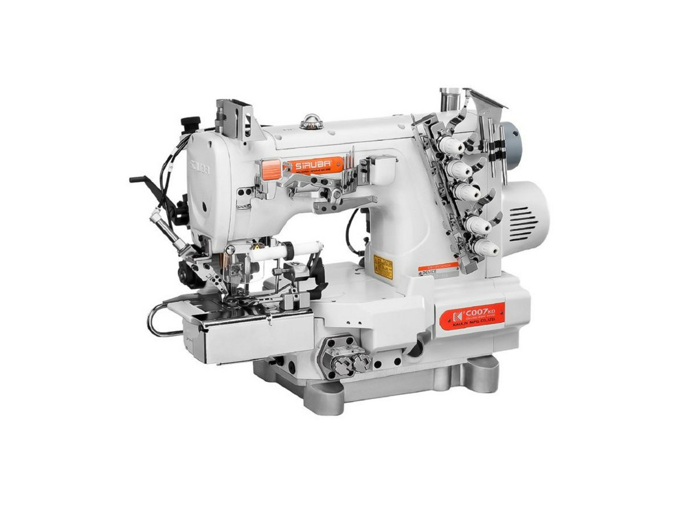 Трехигольная пятиниточная плоскошовная машина с цилиндрической (рукавной) платформой с ножом для правосторонней подрезки среза, автоматическими функциями, задним зубчатым пуллером, пневмонаправителем эластичной тесьмы и роликами натяжения