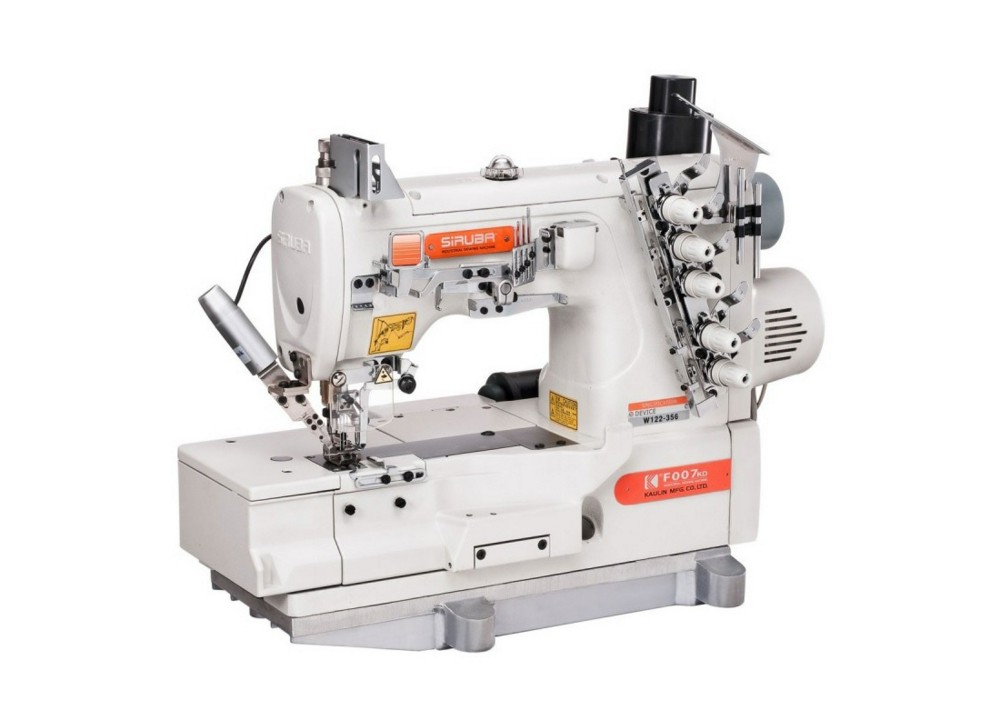 Трехигольная пятиниточная плоскошовная (распошивальная)машина с верхним и нижним застилом, плоской платформой, встроенным серводвигателем с плавной регулировкой скорости, и автоматическими функциями.