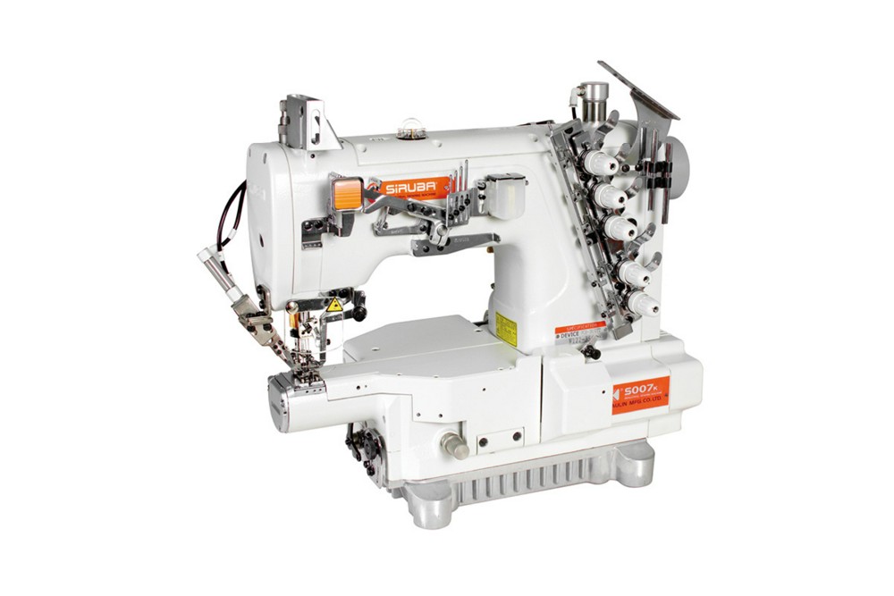 3-игольная 5-ниточная плоскошовная (распошивальная) машина цепного стежка с узкой цилиндрической платформой, встроенным серводвигателем с прямым приводом, верхним и нижним застилом, с приспособлением для подгибания среза