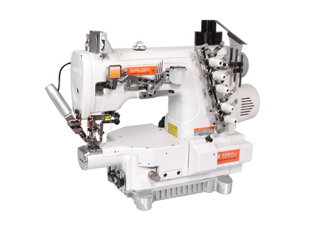 3-игольная 5-ниточная плоскошовная (распошивальная) машина цепного стежка с узкой цилиндрической платформой, верхним и нижним застилом, с встроенным серводвигателем с прямым приводом, устройством обрезки нитей пневматического типа