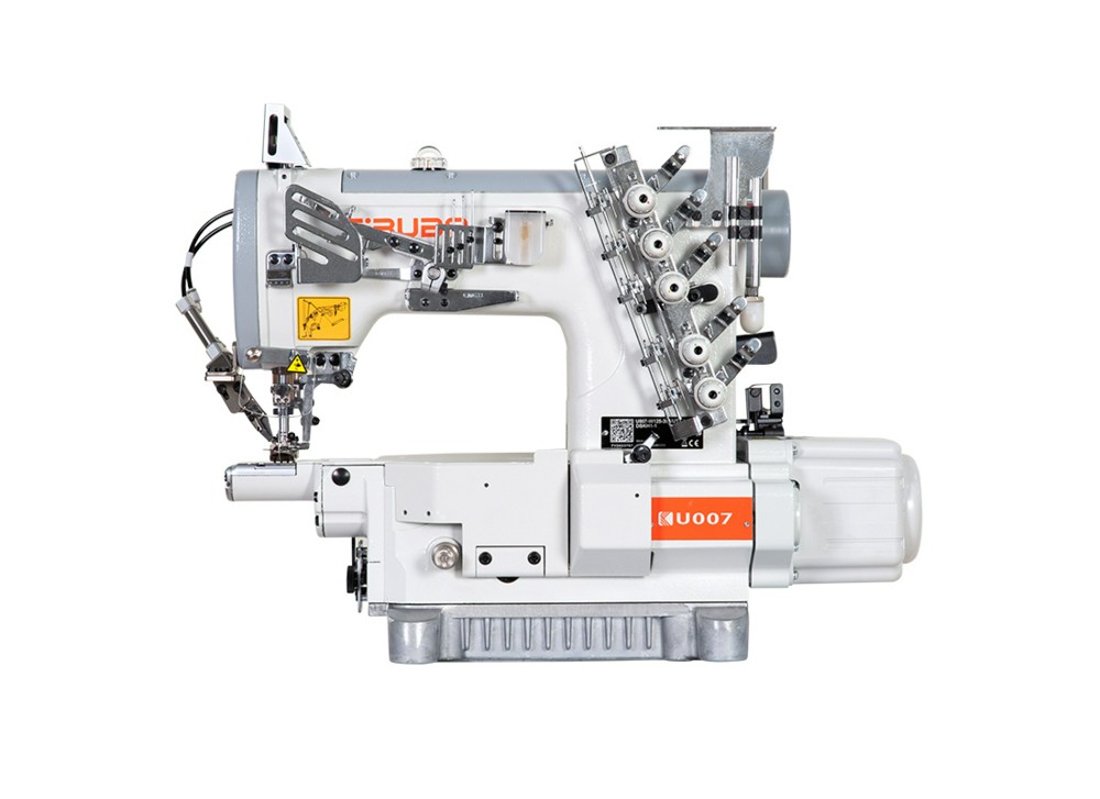 3-игольная 5-ниточная плоскошовная (распошивальная) машина цепного стежка с узкой цилиндрической (рукавной) платформой, встроенным серводвигателем с прямым приводом, верхним и нижним застилом, пневмоустройством обрезки нитей и подъема лапки