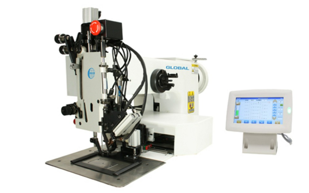 Электронная швейная машина с качающимся челноком большой емкости для сшивания ремней безопасности, стропальных лент, чалок. Ввод шаблона с USB или программирование через пульт управления, стандартная комплектация с устройством охлаждения иглы, обрезка верхней и нижней нити, пневматический зажим веревки, управление по осям X/Yс помощью шаговых двигателей, поле шитья: 130х60 мм, игла: DYx3, 800 ст/мин.
