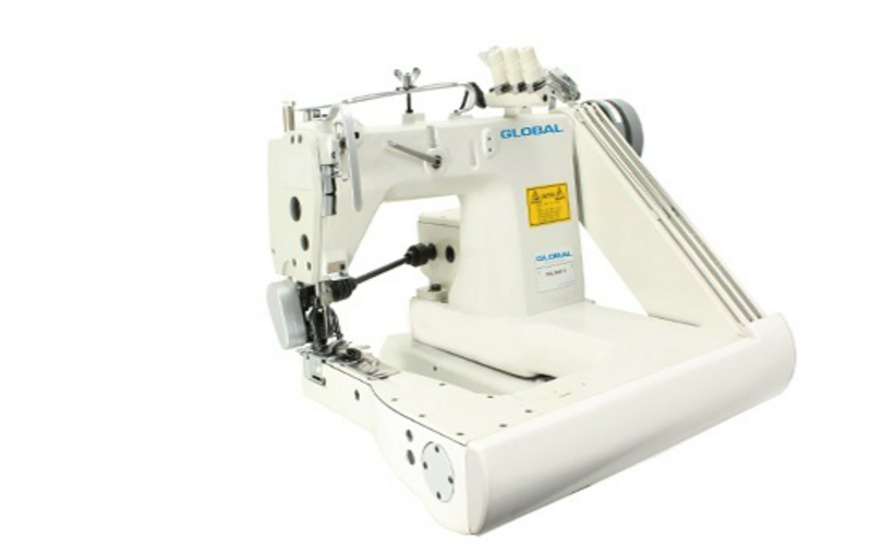 Трехигольная шестиниточная машина цепного стежка для среднетяжелых материалов с П-образной платформой с задним пулером.