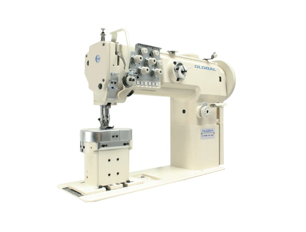 Двухигольная машина челночного стежка с колонковой платформой, унисонным продвижением и увеличенными челноками.