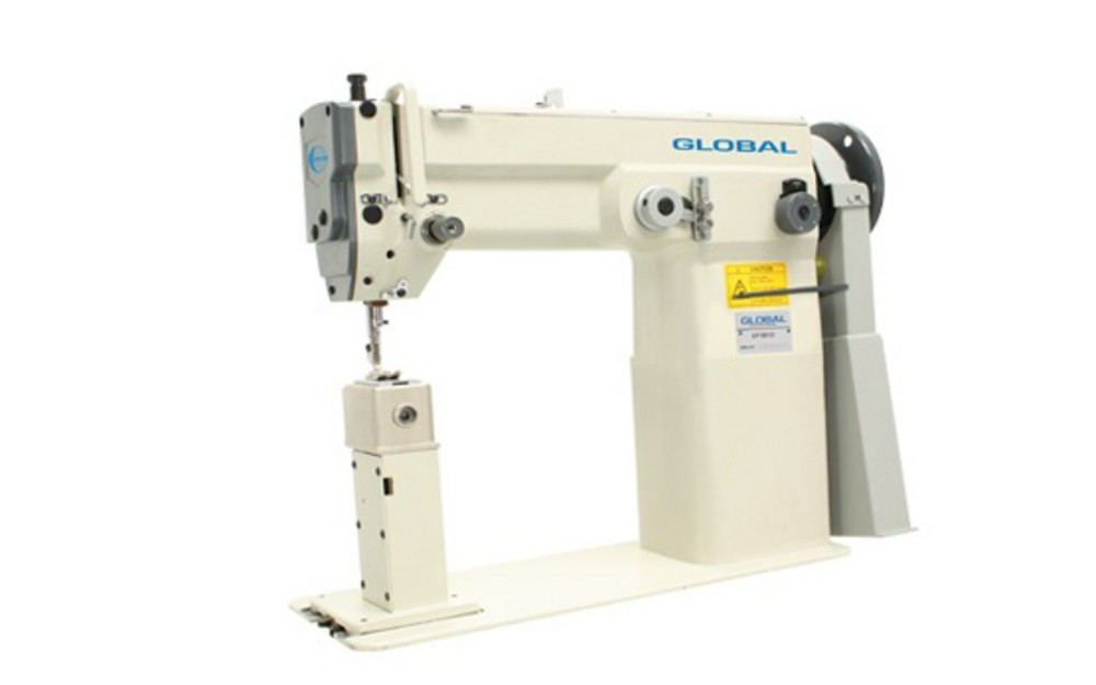 Одноигольная машина челночного стежка двухпрокольной зигзагообразной строчки с нижним продвижением с колонковой платформой для средних материалов.