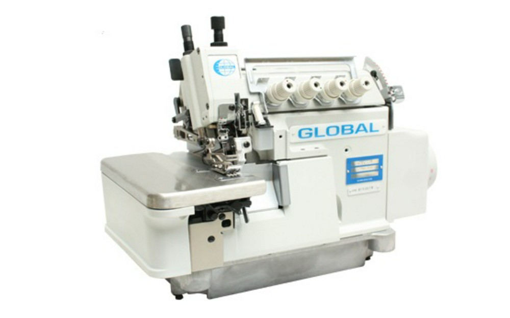 Четырехниточная двухигольная стачивающе-обметочная машина цепного стежка с верхним продвижением (регулируемая шагающая лапка).