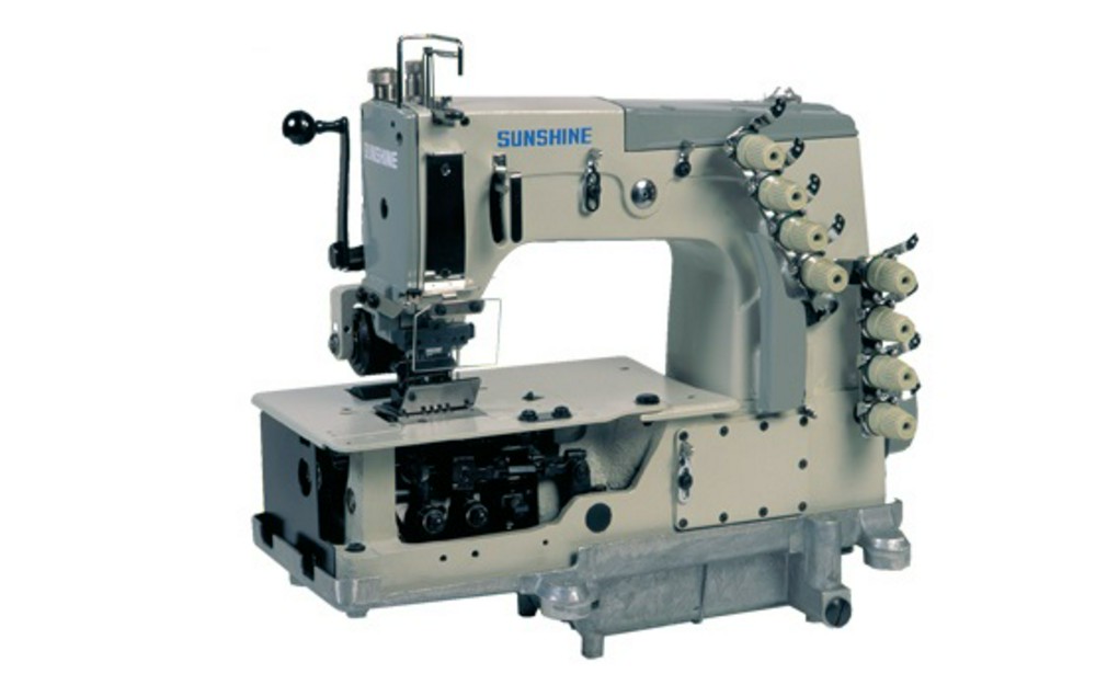 Четырехигольная машина двойного цепного стежка с плоской платформой для настрачивания резинки, с задним пулером,