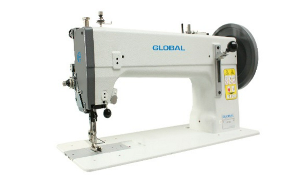 Одноигольная машина челночного стежка для сверхтяжелых материалов с унисонным продвижением и большим качющимся челноком.