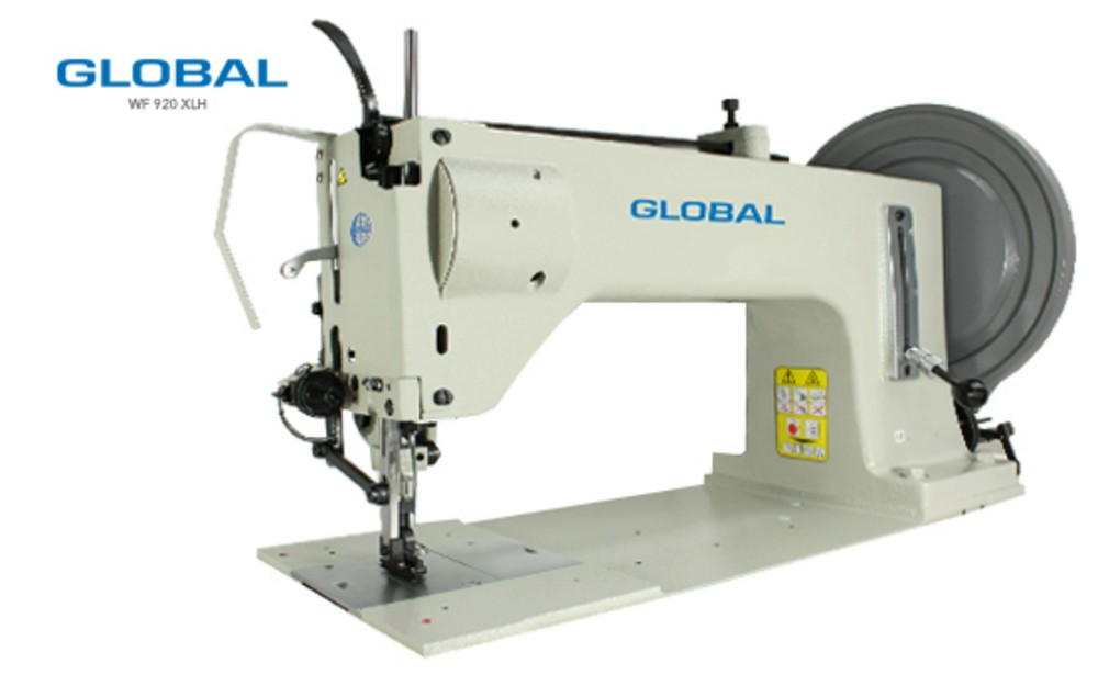 Одноигольная машина челночного стежка для экстримально тяжелых материалов с унисонным продвижением, большим качющимся челноком и увеличенным подъемом лапы.