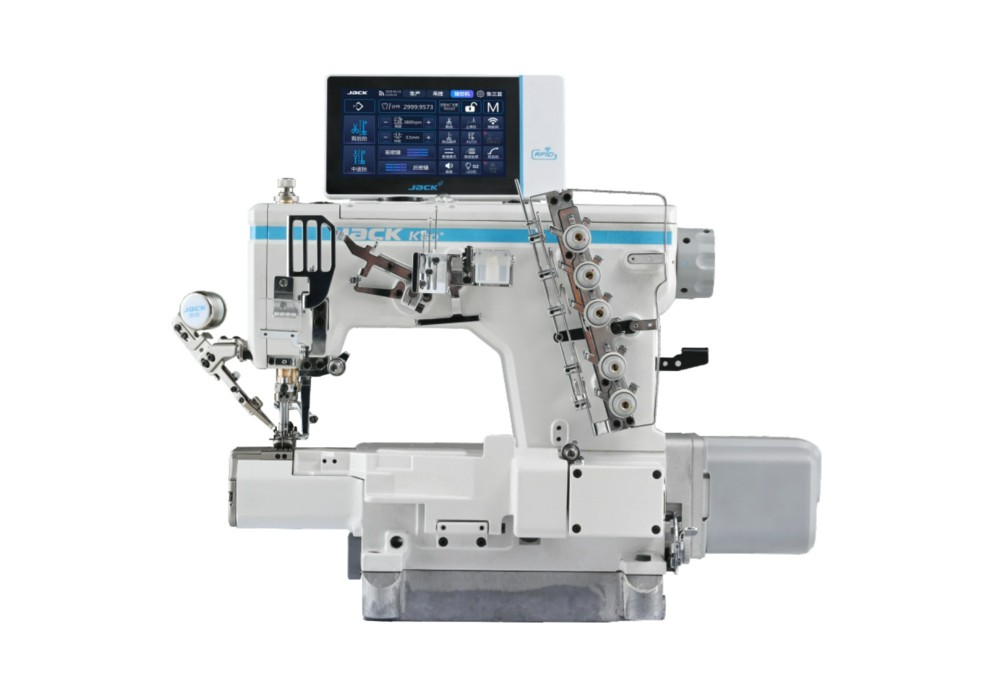 Высокоскоростная трехигольная пятиниточная плоскошовная машина с рукавной платформой, верхним и нижним застилом, встроенным серводвигателем и электронным управлением (выносной пульт с сенсорным дисплеем) и автоматическими функциями