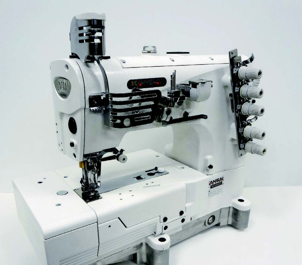 Трехигольная высокоскоростная плоскошовная машина с верхним и нижним застилом с плоской платформой с механизмом внешнего нитепритягивателя нити петлителя, с пневматической обрезкой нити и подъемом лапки.