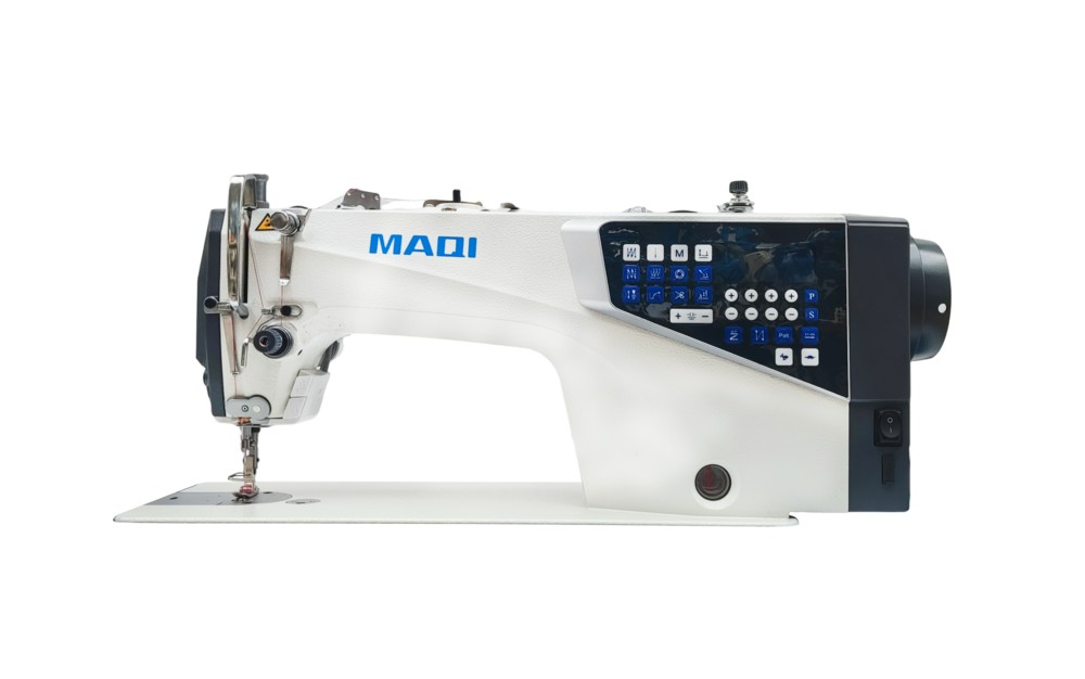 Одноигольная машина челночного стежка с плоской платформой, нижним транспортером, встроенным серводвигателем с прямым приводом, автоматическими функциями и электронным управлением.