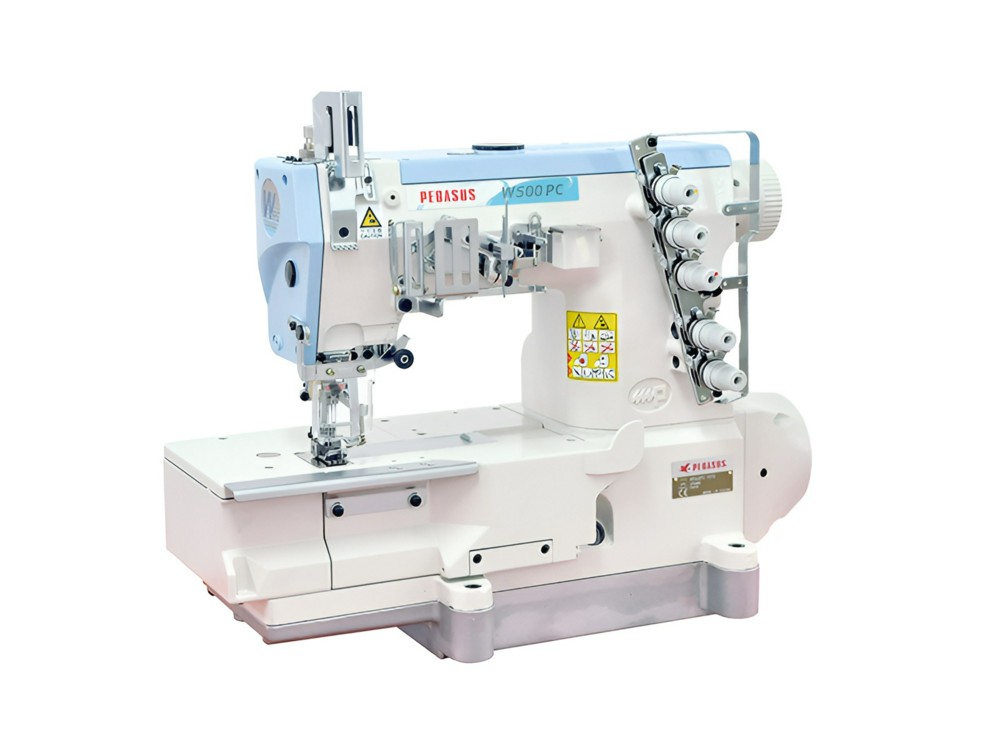 Трехигольная пятиниточная плоскошовная (распошивальная) машина с плоской платформойс приспособлением для окантовки, верхним и нижним застилом с , встроенным серводвигателем с прямым приводом.