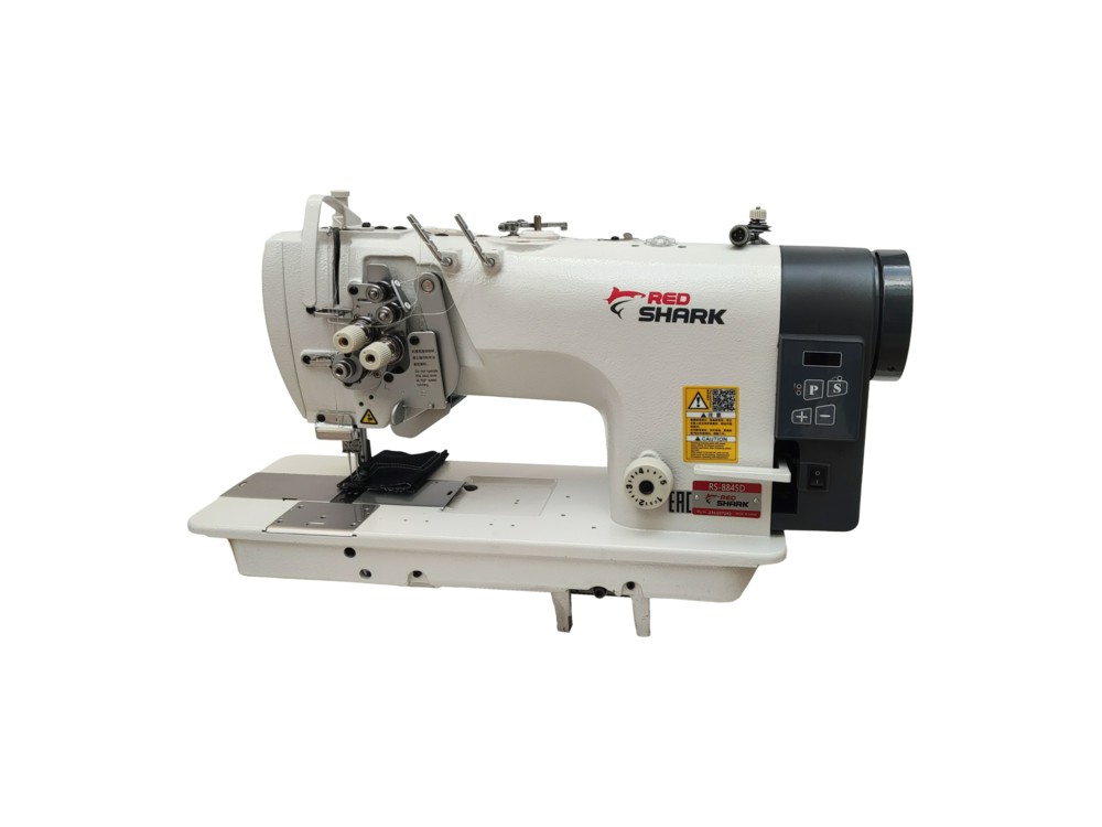 Двухигольная прямострочная машина челночного стежка с игольным и нижним продвижением материалов, с отключением игл и встроенным серводвигателем