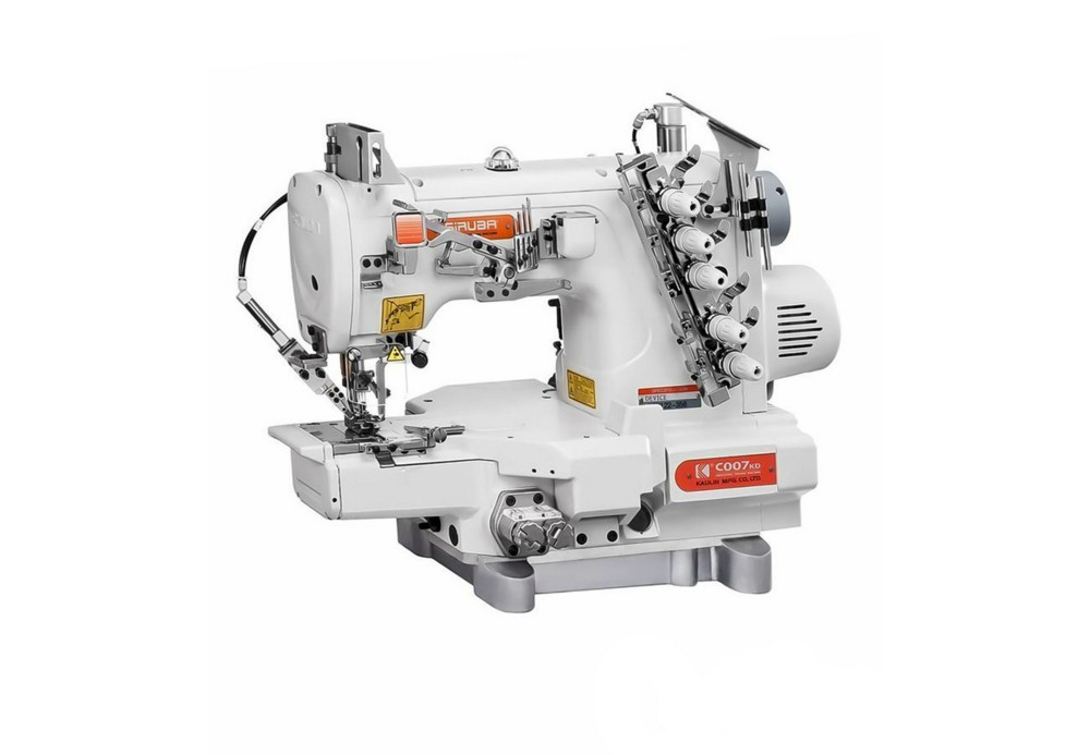 3-игольная 5-ниточная плоскошовная машина цепного стежка с цилиндрической платформой, встроенным серводвигателем с прямым приводом, верхним и нижним застилом, левосторонней подрезкой среза, автоматическими функциями, задним пуллером зубчатого типа, роликами натяжения Применение: застрачивание подогнутого среза по замкнутому контуру (вкруговую) с одновременной левосторонней подрезкой при пошиве изделий из легкого и среднего по толщине трикотажа Преимущества: Автоматические функции (пневмоустройство): обрезка нитей, подъем лапки, удаление обрези Вставка для крепления приспособлений Конструкция платформы обеспечивает близкое расположение материала к игле Энергоэффективный серводвигатель Дифференциальная подача Расстояние между иглами регулируется путем замены комплекта Автоматическая система смазки