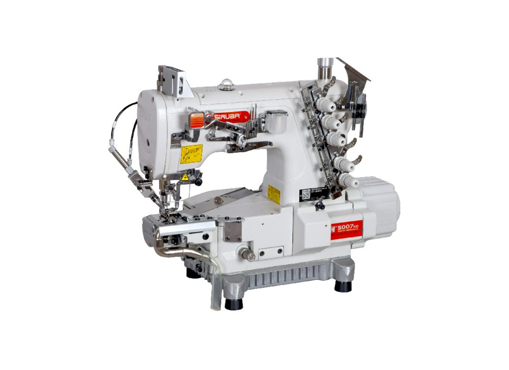 3-игольная 5-ниточная плоскошовная (распошивальная) машина цепного стежка с узкой рукавной платформой, c ножом для левосторонней обрезки среза материала, ним и нижним застилом, с встроенным серводвигателем с прямым приводом, автоматической обрезкой нитей.