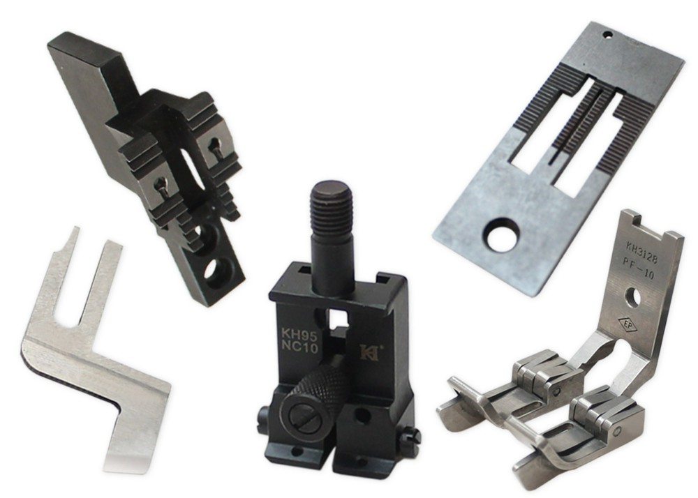 Сменный комплект KHF 95G для использования приспособления KHF 95B, предназначенного для обработки кармана в рамку. В комплект входит лапка, игольная пластина, двигатель ткани, иглодержатель и нож.
