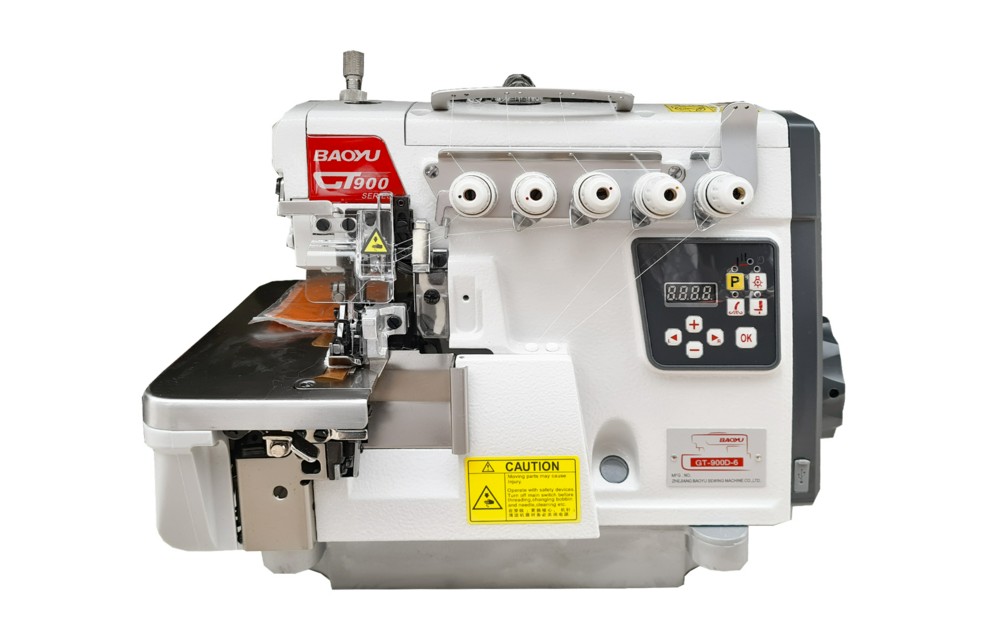 Высокоскоростная шестиниточная трехигольная стачивающе-обметочная машина цепного стежка (6-ти ниточный оверлок) с встроенным серводвигателем и электронным управлением